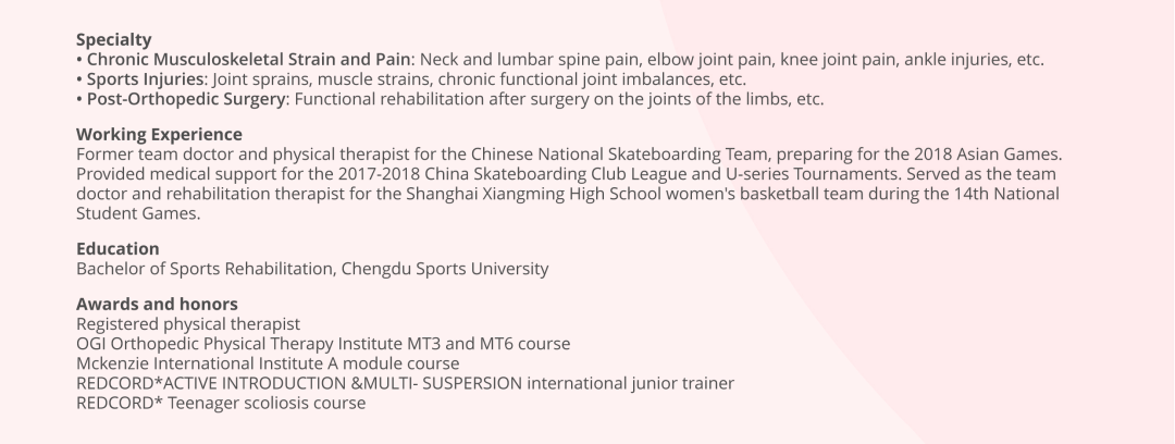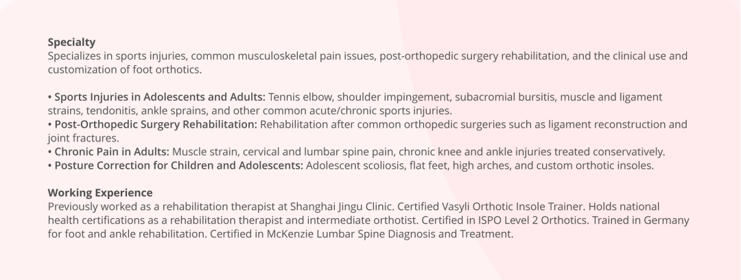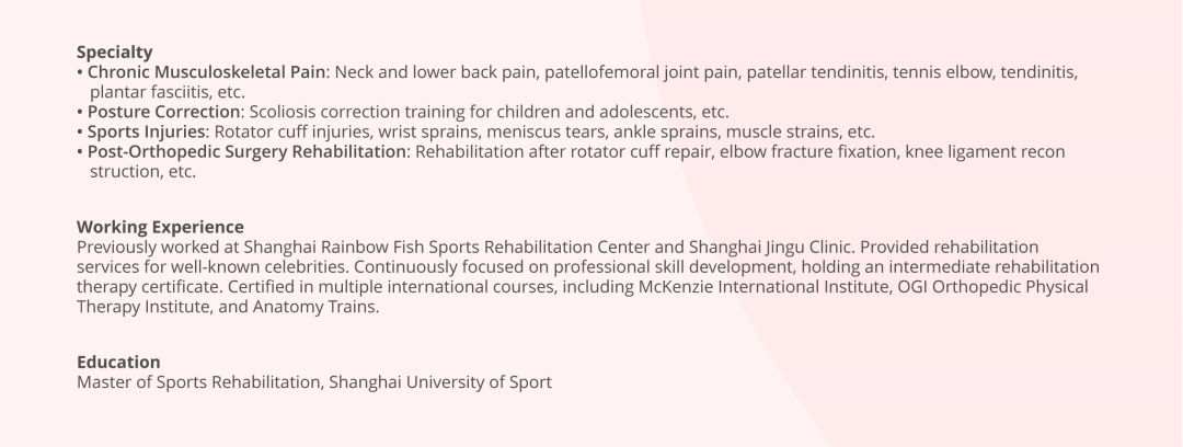 At Am-Sino Healthcare, our sports rehabilitation team follows an international treatment philosophy based on the standards of the American Physical Therapy Association (APTA). Led by Dr. Gong Shuna, a rehabilitation specialist for national team athletes, we combine expertise in sports medicine and rehabilitation with evidence-based practices. We offer personalized performance enhancement plans, effective injury prevention strategies, treatment options, and tailored rehabilitation programs for every patient.